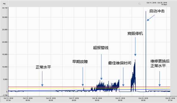 如下圖所示,某機(jī)床通過振動分析,可以看到10月18日振動加速度峰值觸發(fā)早期預(yù)警閾值,但是由于生產(chǎn)計劃問題,沒有停機(jī)維護(hù);10月22日機(jī)床主控系統(tǒng)觸發(fā)故障,不得不停機(jī)過10個小時維修和更換軸承,維修后,振動恢復(fù)正常水平,但較大損失已經(jīng)造成。