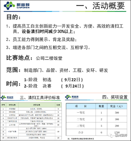 清掃工具的開發(fā)前期已在推進(jìn)中,本期制定了清掃工具開發(fā)的評比方案,計(jì)劃在接下來的兩期精益管理工作中對已開發(fā)的清掃工具進(jìn)行評比,在展示活動(dòng)成果的同時(shí),也為更好的提高各崗位人員的積極性、創(chuàng)造性。