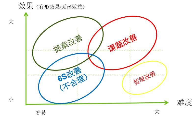 精益生產(chǎn)導(dǎo)入初期先是針對(duì)6S難度小直接回報(bào)低的項(xiàng)目進(jìn)行改善,然后擴(kuò)展到數(shù)據(jù)分析后難度小回報(bào)大的提案進(jìn)行改善。再之后,隨精益生產(chǎn)推進(jìn),日常生產(chǎn)中的疑難問題被識(shí)別出,為主要浪費(fèi),通過(guò)個(gè)人或單個(gè)部門難以解決;同時(shí)這些問題會(huì)分布在產(chǎn)品品質(zhì)、生產(chǎn)成本、產(chǎn)品交期以及6s的疑難問題(半制品三定關(guān)聯(lián)到布局、JIT、自働化),都為等待改善的問題點(diǎn),以怎么樣的的優(yōu)先順序?qū)嵤┱n題改善呢?這沒有固定模式,但這是左右企業(yè)推行精益成敗的關(guān)鍵,我認(rèn)為需要考慮如下幾個(gè)方面: