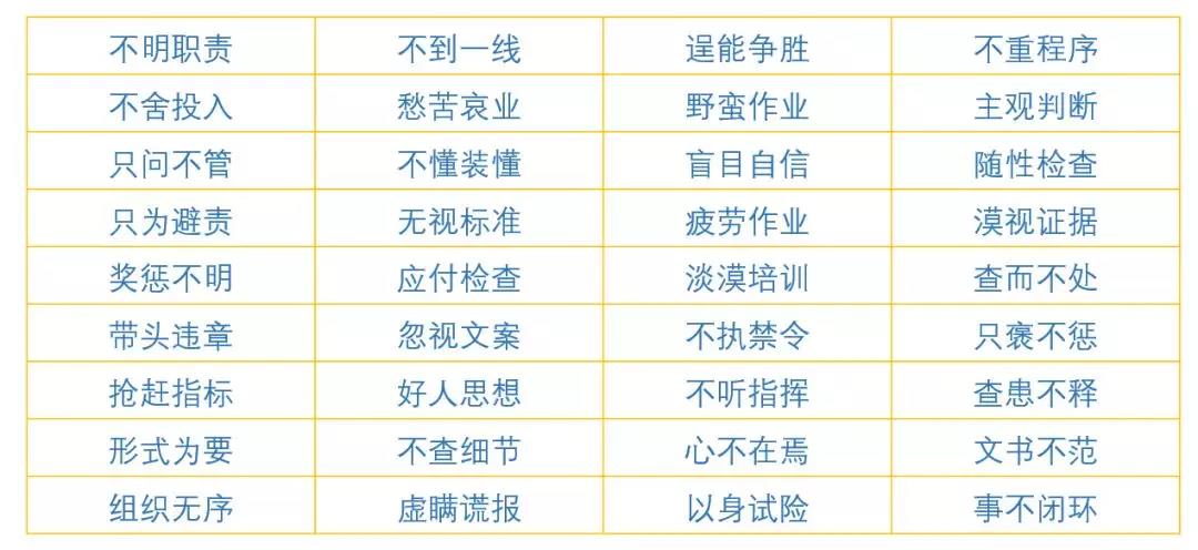 以上36忌,按照縱向分為4個(gè)欄,分別對(duì)應(yīng)主要負(fù)責(zé)人(管理層)、安全員、從業(yè)人員和監(jiān)管人員,每一類(lèi)人員9忌,共36忌。