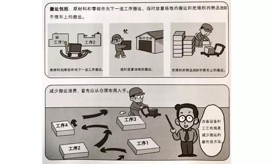 搬運(yùn)動(dòng)作遍及生產(chǎn)活動(dòng)中的各個(gè)流程,包含放置、堆積、移動(dòng)、整理等動(dòng)作,但是搬運(yùn)并不能產(chǎn)生附加價(jià)值,所以它本身就被認(rèn)為是一種浪費(fèi)。搬運(yùn)包括原材料和零部件向下-道工序搬運(yùn)、臨時(shí)放置場(chǎng)地的搬運(yùn)和把堆積的物品放到手推車上的搬運(yùn)。其中,設(shè)備布局不合理、生產(chǎn)線布局不合理、工序流程不合理等是造成搬運(yùn)浪費(fèi)的主要因素。因此,要想消除搬運(yùn)浪費(fèi),首先應(yīng)從合理布局入手,盡可能減少搬運(yùn)。