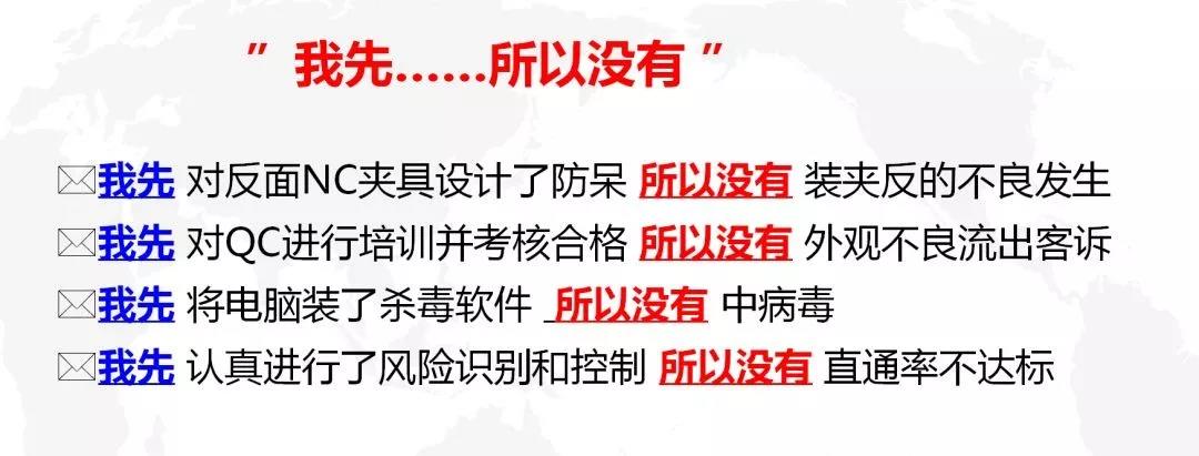 第二步:Do(質(zhì)量風(fēng)險(xiǎn)的識(shí)別和評(píng)估) 只有將質(zhì)量風(fēng)險(xiǎn)識(shí)別出來,然后你才能談到管理和控制。識(shí)別的方法有很多種,你可以采用頭腦風(fēng)暴法,按照產(chǎn)品的過程流程圖,大家集思廣益想在哪個(gè)環(huán)節(jié)可能出現(xiàn)什么樣的質(zhì)量風(fēng)險(xiǎn),先不要想解決辦法;或者也可以找一些有經(jīng)驗(yàn)的領(lǐng)導(dǎo)或者資深的同事,因?yàn)榻?jīng)驗(yàn)都來源于失敗的教訓(xùn),把這些都記錄下來。還可以進(jìn)行預(yù)測(cè)。可能會(huì)有什么潛在的質(zhì)量風(fēng)險(xiǎn)。當(dāng)然最好的方式就是以上三種方法的結(jié)合。