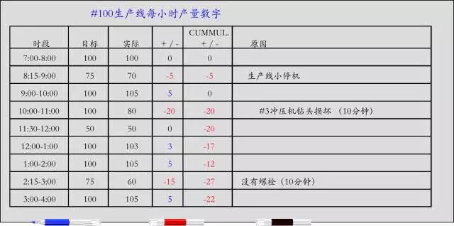 以可視化看板的方式展示每小時(shí)生產(chǎn)進(jìn)度目標(biāo)和實(shí)際達(dá)成,可以向所有人傳達(dá)生產(chǎn)線運(yùn)行好壞的信息,以及相關(guān)的影響因素,督促管理層關(guān)注并及時(shí)采取行動(dòng)改進(jìn)。