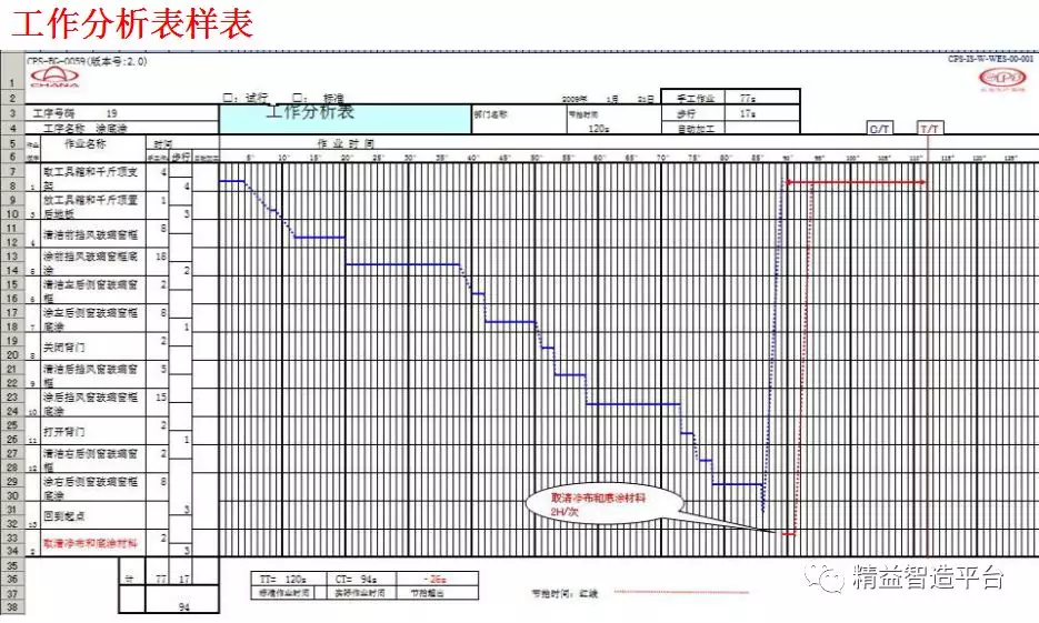 (3)工作分析表——明確各工序的手工作業(yè)、歩行時間等表明在節(jié)拍內(nèi)的作業(yè)內(nèi)容的表格: