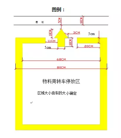 線寬60mm:不良品擺放區(qū)的劃分線(碰到三面圍墻處,第四面地面劃一條紅色實(shí)線);