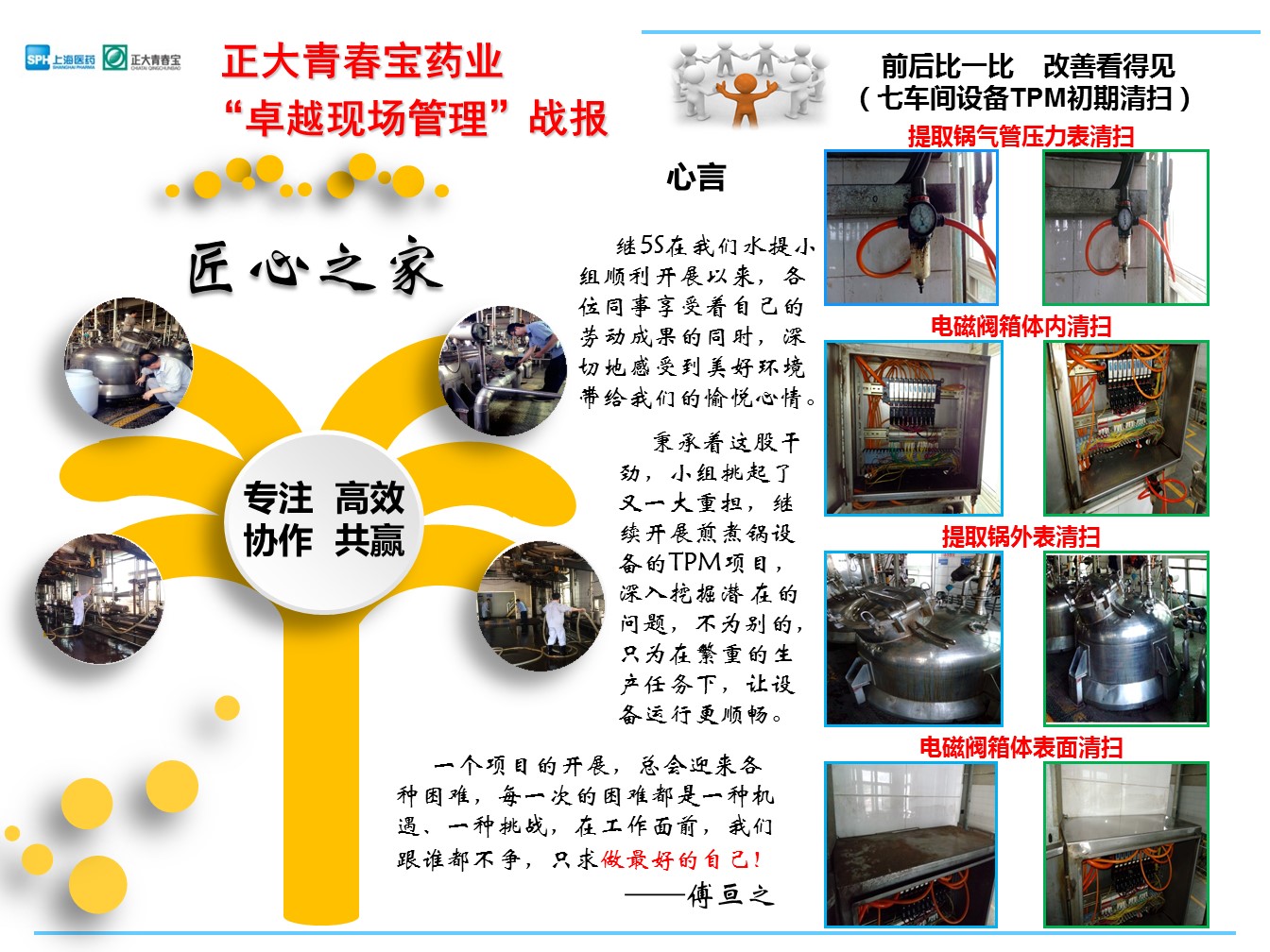秉承著這股干勁,小組挑起了又一大重?fù)?dān),繼續(xù)開展煎煮鍋設(shè)備的TPM項(xiàng)目,深入挖掘潛 在的問題,不為別的, 只為在繁重的生產(chǎn)任務(wù)下,讓設(shè)備運(yùn)行更順暢。
